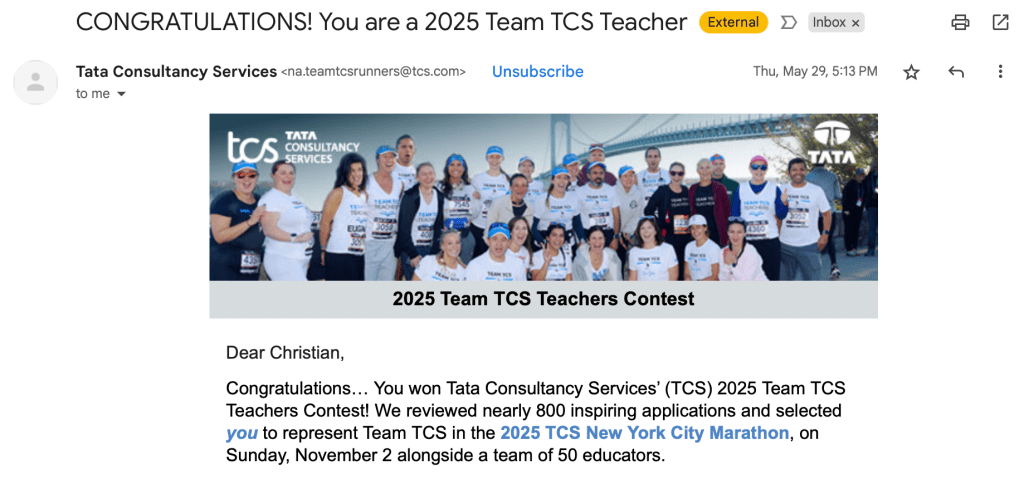 Enter Team TCS teachers. It was the only application I sent out where I didn’t have to sacrifice my first born… or essentially the only marathon entry I could be given without requiring me to raise a whole lot of money. They would allow me to run the race *because* I am a public-school teacher. In other words, I just had to be proud of my profession. And I am. Immensely so. It felt unlikely that I would be win here, because there are a ton of applicants and only 50 spots awarded. However, to my surprise and elation, they accepted me and gave me a spot in the New York City Marathon. So here I am. All team TCS is asking of me is that I proudly advertise that I am a teacher *and* a runner. I can do that.