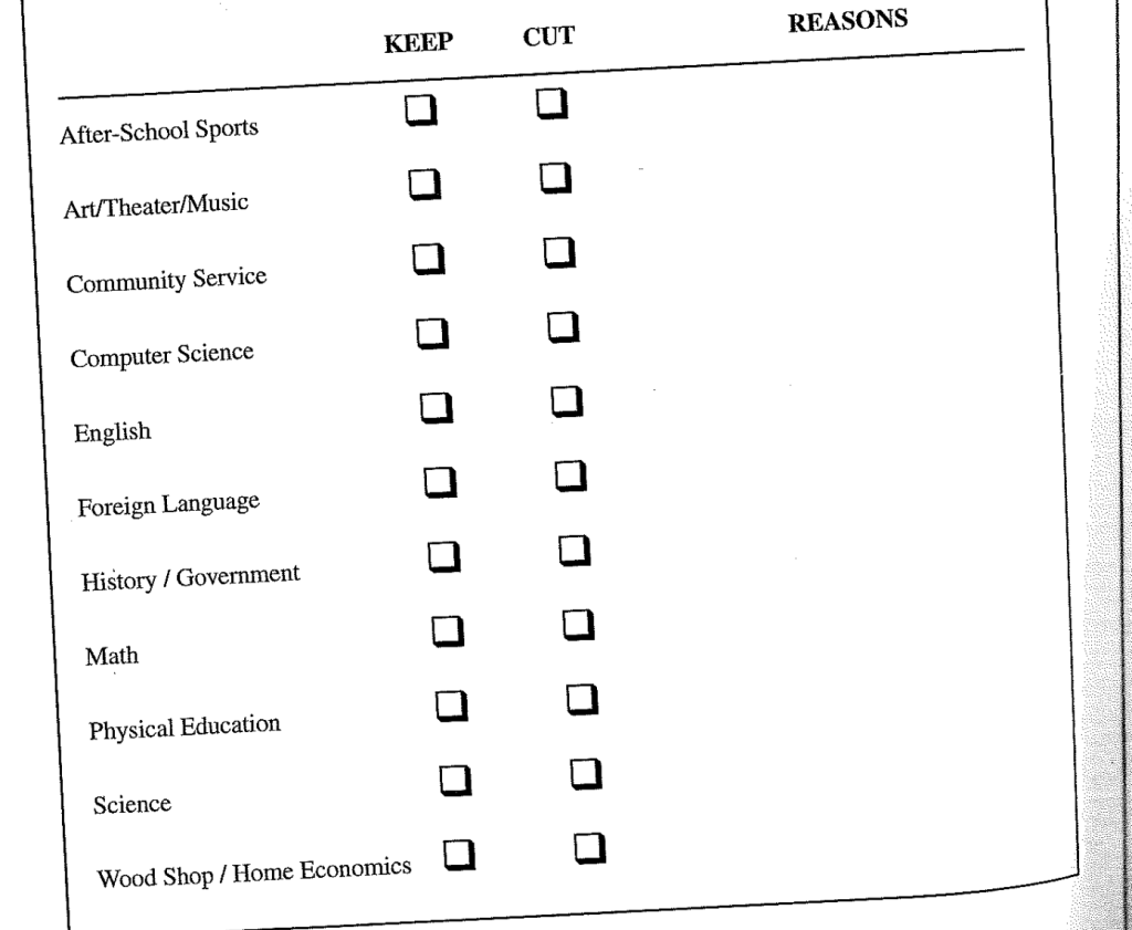 I recently did an activity with my students. In this lesson, they were asked to “Make a recommendation to the school board” on which class offerings they would keep, and which ones they would eliminate. They had to eliminate three of the items you see below. Given the vast budget cuts that have taken place in my district over the past 15 years, this hit them close to home. All of these kids have seen classes and teachers eliminated in their time in our district. The students sat up and locked in. To have power over what classes stay and which ones go? Intriguing. They were given time alone to complete the page you see below, and then time to deliberate with peers before making their final recommendation.
